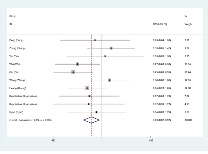 Figure 2: Overall meta-analysis of the relationship between miR-608 rs4919510 polymorphism and cancer risk in recessive model (CC vs. GG+GC).