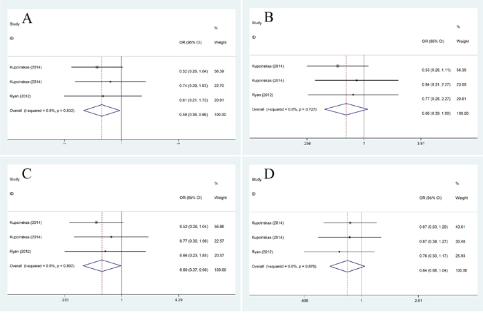 Figure 3: Subgroup analysis of the relationship between miR-608 rs4919510 polymorphism and cancer risk in Caucasians. A. homozygote model (CC vs. GG); B. heterozygote model (CG vs. GG); C. dominant model (CG+ CC vs. GG); D. recessive model (CC vs. GG+GC).