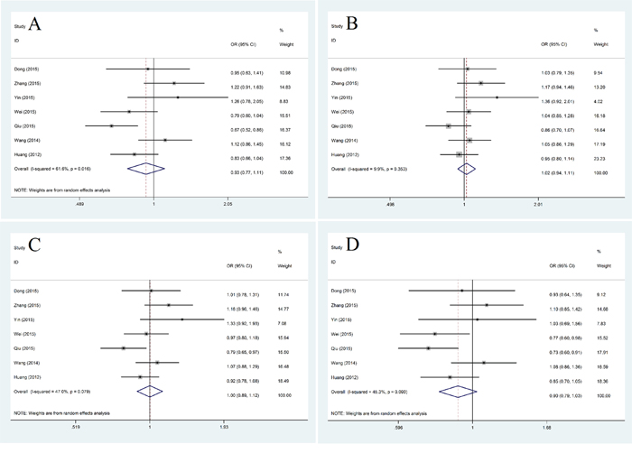 Figure 4: Subgroup analysis of the relationship between miR-608 rs4919510 polymorphism and cancer risk in Asians. A. homozygote model (CC vs. GG); B. heterozygote model (CG vs. GG); C. dominant model (CG+ CC vs. GG); D. recessive model (CC vs. GG+GC).