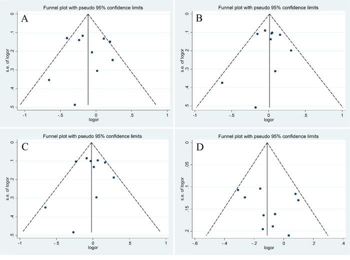 Figure 5: Funnel plot for publication bias test. A. homozygote model (CC vs. GG); B. heterozygote model (CG vs. GG); C. dominant model (CG+ CC vs. GG); D. recessive model (CC vs. GG+GC).