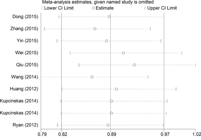 We utilized Funnel Plot, Begg’s funnel plot and Egger’s test to evaluate publication bias. The almost symmetrical shape of the funnel plots for four genetic models did not reveal any significant publication bias (Figure 5). There was also no evidence of publication bias in Begg’s funnel for all genetic models (P > 0.05)(Figure 6). We also did not find out publication bias in Egger’s test in homozygote model (CC vs. GG, P= 0.977), heterozygote model (CG vs. GG, P=0.744), dominant model (CG+ CC vs. GG, P=0.772) and recessive model (CC vs. GG+GC, P=0.440). Sensitivity analysis through evaluating the influence of each study on overall ORs showed that the omission of any study made no significant difference (Figure 7).