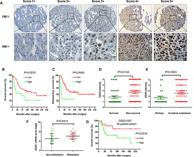 Figure 1: Association of EZH2 protein expression and clinical outcome in osteosarcoma patients. (A) Representation images of different immunohistochemical staining intensities of EZH2 protein expression in osteosarcoma tissues are shown on TMA sections. EZH2 immunoreactivity was found mostly in the nucleus of tumor cells. EZH2 expression was classified into 1 to 5 categories according to the EZH2 staining intensity and extension values: 1+ (score 0), 2+ (score 1–2), 3+ (score 3–4), 4+ (score 6–8), and 5+ (score 9–12) staining. For statistical analysis, groups 4+ and 5+ were defined as high expression of EZH2, and the other final scores were considered as low expression. (B) Kaplan–Meier curves depicting overall survival rates in the two sets of osteosarcoma patients by EZH2 staining (low and high). (C) Kaplan–Meier curves depicting disease free survival rates in the 2 sets of osteosarcoma patients by EZH2 staining (low and high). (D) Distribution of EZH2 staining scores among the survival and non-survival patients. (E) Distribution of EZH2 staining scores among primary and metastasis patients at initial diagnosis. (F) Levels of EZH2 mRNA expression among osteosarcoma patients who developed metastases and patients with non-metastases within five years. (G) Kaplan-Meier curves depicting overall survival rates in the two sets of osteosarcoma patients by EZH2 mRNA expression (low and high).