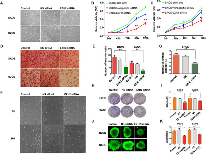 Figure 3: Effects of EZH2 silencing on osteosarcoma cell proliferation, migration, and invasion. (A) Representative images of osteosarcoma cells after transfection with non-specific siRNA or EZH2 siRNA in a 12-well plate. (B and C) Effects of EZH2 knockdown on osteosarcoma cell growth and proliferation after transfection with either non-specific siRNA or EZH2 siRNA (*P < 0.01. **P < 0.001). (D and E) Transwell assays to assess osteosarcoma cell migration after EZH2 knockdown (crystal violet staining of migratory cells; **P < 0.001; scale bar, 50 mm). (F) Micrographs of osteosarcoma SAOS cells at 0 and 36 hours after wounding. (G) Migration distance of SAOS for each time point and condition (**P < 0.001). (H and I) Representative results of colony formation of osteosarcoma cell lines transfected with non-specific siRNA or EZH2 siRNA (*P < 0.01. **P < 0.001). (J and K) Formation of spheres from osteosarcoma cell lines transfected with non-specific siRNA or EZH2 siRNA accessed by three-dimensional cell culture. All the results were reproducible in three independent experiments. The data are presented as the mean ± SD. *P < 0.01).