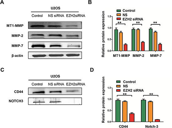 Figure 4: Effects of EZH2 silencing on the expression of metastasis-associated proteins and stem cell markers in osteosarcoma cell lines. (A) The levels of MT1-MMP, MMP-2, and MMP-7 were detected in cells after transfection with non-specific siRNA or EZH2 siRNA and determined by western blot analysis. (B) Western blots from A were analyzed by densitometry, which was carried out using Image J software and normalized to β-actin expression. (C) The levels of CD44 and Notch-3 were detected in cells after transfection with non-specific siRNA or EZH2 siRNA and evaluated by western blot analysis. (D) Western blots from C were analyzed by densitometry as described in Materials and Methods. All the results were reproducible in three independent experiments. The data are presented as the mean ± SD with **P < 0.001.