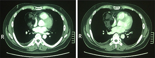 Figure 1: The original chest computed tomography of the patient. The CT showed a well-circumscribed cystic and solid mass lesion in the right portion of the superior mediastinum measuring 6 × 5 cm with right pleural effusion.