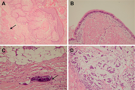 Figure 2: Microscopically, the tumor contained a mature cystic teratoma component with malignant transformation of mucinous adenocarcinoma (H and E, ×200). (A) The cyst wall showed keratinizing squamous epithelium, sebaceous glands, and areas of smooth muscle (arrow). (B) Pseudostratified ciliated columnar epithelium was observed lining along the internal surface of partial cyst wall. (C) In addition, some solid areas exhibited adipose tissue, fibrous tissue, and small foci of calcifications (arrow). (D) The malignant transformation of mucinous adenocarcinoma was also identified interspersed between the benign teratomatous elements.