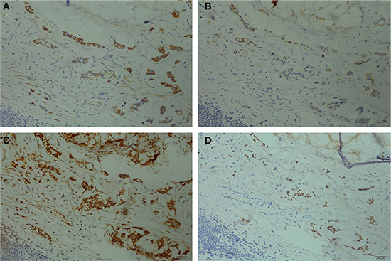 Figure 3: Immunohistochemical staining presented side-by-side on the same tissue (×200). Malignant cells (adenocarcinoma) were positive for CK 7 (A), CK 20 (B), CEA (C), and CDX2 (D).
