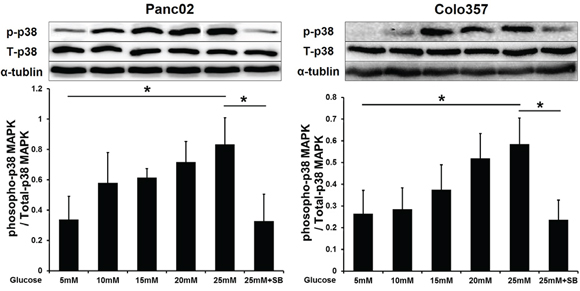 In summary, the present study demonstrates that a p38 MAPK inhibitor can suppress HG- or diabetes-induced tumor growth. In addition, the p38 MAPK inhibitor partially reversed EMT and inhibited distant metastasis by reducing inflammatory responses. Therefore, p38 MAPK is likely to become an effective therapeutic target for treating diabetic pancreatic cancer patients.