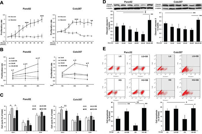 Figure 2: SB203580 inhibits HG-induced PC cell proliferation and anti-apoptotic effects in vitro. A. Examination of the proliferative capacity of PC cells after cultivation in growth media containing varying concentrations of glucose or mannitol (0-50 mM) for 24 h (n=6/group). B. Examination of PC cell proliferation after cultivation in growth media for 12, 24 or 48 h (n=6/group). *, 5 mM vs. 5 mM plus SB203580; #, 5 mM vs. 25 mM; ☨, 25 mM vs. 25 mM plus SB203580. C. Flow cytometric analysis of the PC cell cycle at 24 h. D. Cleaved caspase 3 levels in PC cells after culture with different glucose concentrations for 24 h (n=3/group). E. Flow cytometric analysis of PC cell apoptosis at 24 h. * P < 0.05, ** P < 0.01, *** P < 0.001, # P < 0.05, and ☨ P < 0.05.