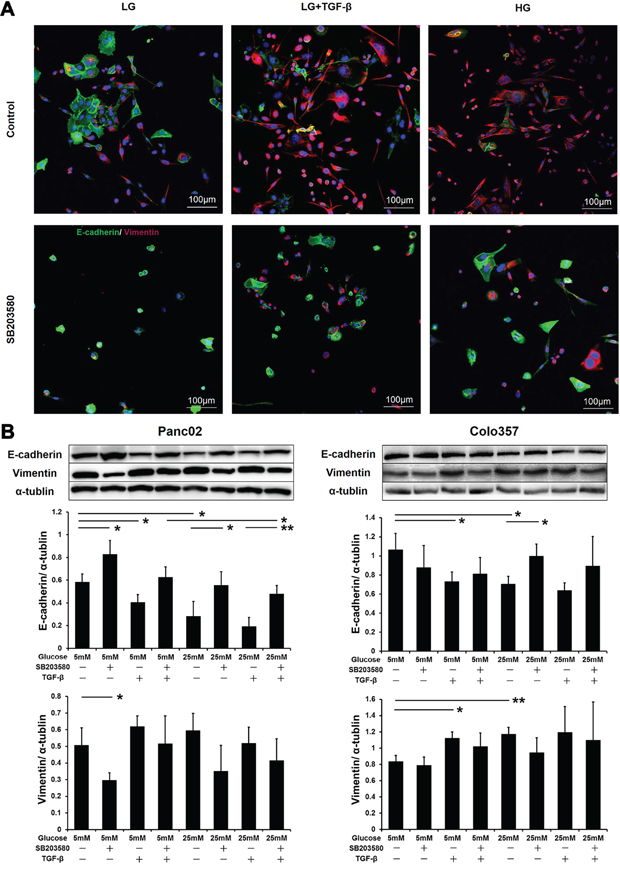 Figure 4: SB203580 inhibits HG-induced tumor cell EMT in vitro. A. Panc02 cells were subjected to E-cadherin/vimentin double immunostaining. 4',6-Diamidino-2-phenylindole (DAPI) was applied as an internal control. B. Expression levels of E-cadherin and vimentin in PC cells after culture in low-glucose medium, high-glucose medium, or medium containing 10 μM SB203580 or 10 ng/ml TGF-β for 24 h (n=3/group). * P < 0.05 and ** P < 0.01.
