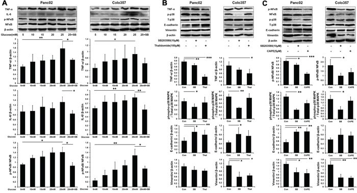 Figure 5: SB203580 inhibits HG-induced EMT through the TNF-α and p-NFκB pathways. A. Expression level of TNF-α, IL-6 and p-NFκB in PC cells cultured in media with varying concentrations of glucose (5-25 mM) or in HG medium (25 mM) containing 10 μM SB203580 for 24 h (n=3/group). B. PC cells were treated with 100 μM thalidomide for 24 h, and EMT markers were detected (n=3/group). C. PC cells were treated with 5 μM CAPE for 24 h, and EMT markers were detected (n=3/group). * P < 0.05, ** P < 0.01, and *** P < 0.001.
