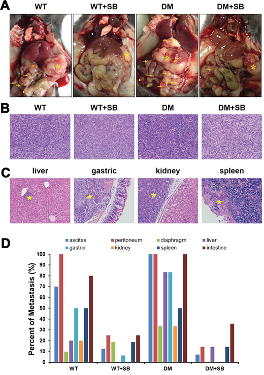 Figure 7: Treatment with SB203580 reduces the incidence of cancer metastases in diabetic mice with pancreatic cancer. A. Representative gross anatomy images of the different groups of mice. * marks the location of the primary pancreatic tumors, while the arrows indicate the metastatic sites in the peritoneal cavity. B. Representative HE-stained images of orthotopic pancreatic tumors in the different groups of mice. Magnification, 200×. C. Representative HE-stained sections of the potential target organs of pancreatic tumor metastasis. Magnification, 200×. D. Examination of the presence or absence of ascites and ratios of peritoneal, diaphragmatic, liver, gastric, renal, splenic and small bowel metastases.