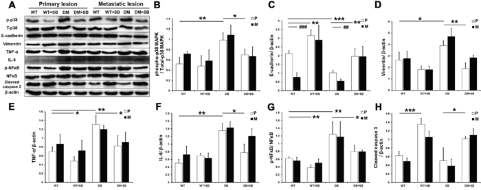 Figure 8: SB203580 inhibits EMT and the expression of inflammatory factors in diabetic pancreatic cancer in vivo. A. p38 MAPK phosphorylation and the protein expression levels of E-cadherin, vimentin, TNF-a, IL-6, p-NFκB, NFκB and cleaved caspase 3 in primary tumor tissues and metastatic lesions (intestinal metastatic sites) obtained from the WT, WT+SB, DM and DM+SB groups. B-H. Quantitation of the expression levels of the above proteins in the primary tumors from the different groups (n=5/group). P: primary lesion; M: metastatic lesion. * P < 0.05, ** P < 0.01, *** P < 0.001, ## P < 0.01, and ### P < 0.001.
