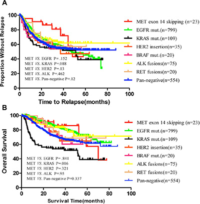 Figure 2: (A) Kaplan–Meier survival curves for relapse free according to MET exon 14 skipping or other known oncogenic drivers in 1635 NSCLC patients; (B) Overall survival according to MET exon 14 skipping or other known oncogenic drivers in 1393 NSCLC patients. Pan-negative indicates EGFR, KRAS, HER2, BRAF, ALK, RET, and MET negative.
