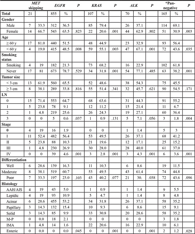 The proportion of precancerous or early lesions (AAH/AIS/Lepidic) (38.1%) in MET exon 14 skipping tumors was significantly higher than that of EGFR (15.9%), KRAS (5.6%), HER2 (21.9%), BRAF (15%), ALK (2.9%), RET (5.6%), and pan-negative (10.3%) lung adenocarcinomas, indicating that mutant MET alone might be insufficient to transform normal cells but depend on other genetic alterations progressing into more aggressive carcinoma subtypes.