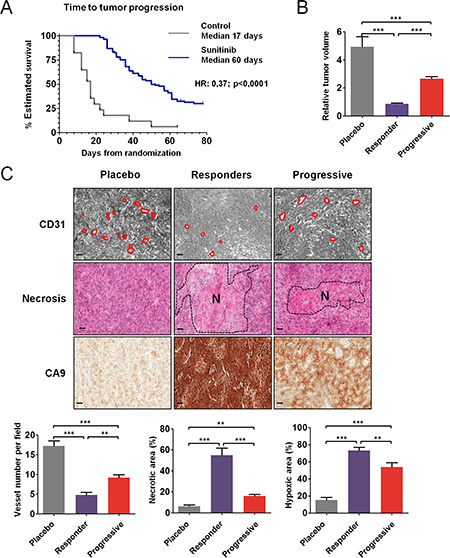 Figure 1: Antitumor and antiangiogenic effects of sunitinib in CAKI-1 RCC xenografts. (A) Time to tumor progression (TTP) using Kaplan Meier estimate from 131 mice TTP data. (B) Relative tumor volume according to T0. Data are pooled from 15, 46 and 67 animals per group, respectively. Bars indicate the mean ± SEM. (C) Representative tumors from the placebo, responder, and progressive groups of vessel number, necrosis, and hypoxia detected by CD31, HE, and CA9 staining, respectively. The dashed region indicated the necrotic (N) area. Bars, 100 μm. (Below) Quantitative analysis of CD31, HE, and CA9 staining. Data are pooled from 5 animals per group. Bars indicate the mean ± SEM. (B and C) P-values were calculated using unpaired Student’s t tests: **P < 0.01, ***P < 0.001.