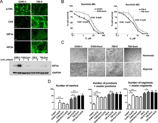 Figure 2: In vitro characterisation of acquired resistance to sunitinib in RCC cells. (A) Expression of p-VHL, CA9, HIF1α and HIF2α by immunofluorescence in CAKI-1 and 786–0 cells under normoxia or hypoxia induced by 24 h exposure to 100 μM CoCl2. Representative pictures of three independent experiments. Bars, 100 μm. (B) Forty-eight hours sunitinib cytotoxicity in CAKI1, CAKI- Suni, 786–0 and 786-Suni models. (C) Pseudo-tubes formation by CAKI-1, CAKI-Suni, 786–0 and 786-Suni tumor cells on Matrigel after 24 h cell incubation in normoxia and hypoxia induced by 100 μM CoCl2. (D) Quantification of the tubes formation parameters by « Angiogenesis Analyzer » from Image J software. Data are pooled from three independent experiments. Bar indicate the mean ± SEM. P-values were calculated using unpaired Student’s t tests: *P < 0.05, **P < 0.01, ***P < 0.001.