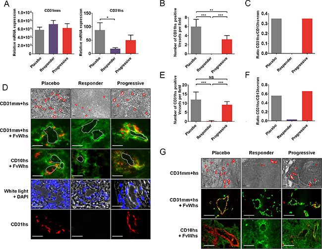 In mice, endothelial cells that form the tumor vascular network of engrafted tumor cells are from mouse origin. Since RCC cell lines displayed vasculogenesis capabilities in vitro, we evaluated whether these capabilities may be involved in tumor resistance in vivo through vasculogenic mimicry. By RT-PCR, there was no significant difference in relative expression of mouse CD31 (CD31mm) mRNA in tumors of mice receiving placebo or sunitinib in CAKI-1 tumors (Figure 3A). However, relative expression of human CD31 (CD31hs) mRNA was significantly lower in tumors of mice that responded to sunitinib, compared to control tumors (P < 0.05) (Figure 3A). Moreover, CD31hs expression was higher in tumors of mice that progressed under sunitinib than in tumors of mice that responded to sunitinib. Quantification of CD31hs staining by immunohistochemistry revealed that sunitinib affected the number of vessels associated with positive CD31hs cells at the time of response and progression. Tumors of mice that responded to sunitinib had significantly fewer vessels associated with positive CD31hs staining per field than tumors of mice that progressed (P < 0.001) (Figure 3B). Previous studies have shown that cancer cells may differentiate into endothelial cells and become involved in tumor angiogenesis by participating in vessel wall formation [30]. In placebo treated tumor cells, expression of human FvW (FvWhs) was observed in the vicinity of CAKI-1 tumor vessels as shown by FvWhs and CD31 co-staining (Figure 3D). Further suggesting that endothelial cells in the vicinity of vessel originate from human cancer cell, we found that FvWhs-stained cells coexpress human CD10 (CD10hs), a kidney-specific marker (Figure 3D). Interestingly, cells expressing FvWhs or CD31hs were detectable in the vicinity of tumor vessels, absent in tumors that responded to sunitinib treatment and present in the vessel rim of tumors at the time of progression (Figure 3D).