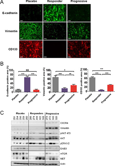 Figure 6: Sunitinib resistance is associated with tumor differentiation. (A and B) Immunofluorescence examination (A) and quantitative analysis (B) of CD133, vimentin, and E-cadherin expression in placebo and sunitinib-treated tumors. Data are pooled from 6–8 animals per group. Bars indicate the mean ± SEM. P-values were calculated using unpaired Student’s t tests: *P < 0.05, **P < 0.01, ***P < 0.001, NS, P ≤ 0.05. (C) Protein expression by western blot of selected genes in sunitinib-treated tumors. Representative expression of 4–5 mice per group.
