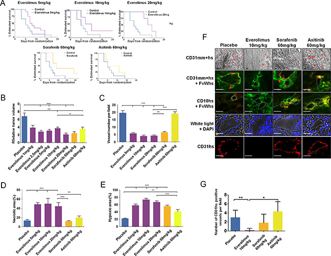 Figure 7: Everolimus effects on in vivo sunitinib-resistant tumors. (A) Time to progression (TTP) of mice treated with everolimus (5, 10, and 20 mg/kg), sorafenib (60 mg/kg), or axitinib (60 mg/kg) using Kaplan Meier estimate from 56 mice TTP data. (B) Relative tumor volume at the end of second-line treatment with everolimus (1, 2.5, 5, 10, and 20 mg/kg), sorafenib (60 mg/kg), or axitinib (60 mg/ kg) according to T0. Data are pooled from 4–12 animals per group. Bars indicate the mean ± SEM. (C-E) Vessel numbers per field (C), percentage of necrotic area (D) and hypoxic area (E) in sunitinib-resistant CAKI-1 tumors from mice treated with everolimus, sorafenib, or axitinib. Bars indicate the mean ± SEM. P-values were calculated using unpaired Student’s t tests: *P < 0.05, **P < 0.01, ***P < 0.001. (F) Bright field and immunofluorescence examination of CD31 (CD31mm+hs), human CD31 (CD31hs), human FvW (FvWhs), and human CD10 (CD10hs) expression in tumors after second-line treatment with everolimus (10 mg/kg), sorafenib (60 mg/kg) or axitinib, (60 mg/ kg). Red lines indicate vascular lumens. Bars, 100 μm. (G) Number of CD31hs stained vessels per field. Bars indicate the mean ± SEM of 10 high magnification fields. P-values were calculated using unpaired Student’s t tests: *P < 0.05, **P < 0.01.