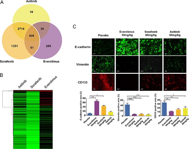 Figure 8: Molecular changes and tumor differentiation induced by second line treatment with everolimus, sorafenib and axitinib in sunitinib-resistant tumors. (A) Identification of differentially regulated expression profiles in the second line treatments. All 1.75 fold or greater (p < 0.05) gene expression changes between the second line placebo and sorafenib, axitinib, or everolimus were input into a genomics Venn calculator to identify genes whose expression profiles were shared or unique between the three second line treatments relative to the placebo. (B) Hierarchical clustering of gene expression fold changes for the 372, 497, and 82 genes in the axitinib, sorafenib, and everolimus treatments, respectively. (C) Immunofluorescence examination and quantitative analysis of CD133, vimentin, and E-cadherin expression in tumors after second-line treatment with everolimus, axitinib, or sorafenib. Bars, 100 μm. Data are pooled from 4 animals per group. Bars indicate the mean ± SEM. P-values were calculated using unpaired Student’s t tests: *P < 0.05, **P < 0.01, ***P < 0.001.