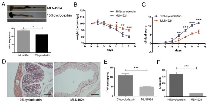 In order to confirm whether neddylation had any effect on inflammatory injury and autoimmune disorders, we examined the in vivo effect of a neddylation inhibitor, MLN4924, in an IBD model. Mice received 4% DSS (dextran sulfate sodium) were divided into two groups, given either 30mg/kg MLN4924 or 10% cyclodextrin intraperitoneal injection daily, respectively. The length of colon from control group was shorter than MLN4924 treated group and the stools of control mice were red and shapeless (Figure 1A), suggesting that MLN4924 ameliorated the DSS-induced colon shortening. Moreover, mice treated with MLN4924 lost weight in a relatively moderate way in response to DSS administration compared with the control group (Figure 1B). Additionally, a reduction of clinical scores was observed in MLN4924 treated group (Figure 1C). These results indicated that neddylation inhibition alleviated colitis development at a certain extent.