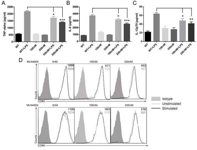 Figure 2: Inhibition of neddylation suppressed DC functions. ELISA quantification of A. TNF-α, B. IL-6 and C. IL-12p70 release in the presence or absence of vehicle, MLN4924 and LPS in BMDCs at indicated doses. D. CD80 (upper) and CD86 (lower) surface marker expression levels were declined with the risen dosage of MLN4924. One representative experiment of 3 is shown in cells treated in triplicate. *p < .05, **p < .01, ***p < .001.