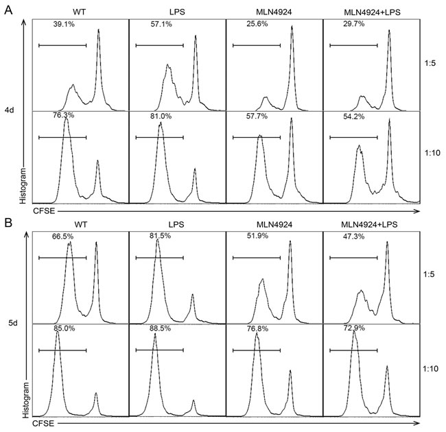 Figure 3: Stimulate activity of DC is reduced in the presence of MLN4924. BALB/c BMDCs were pretreated with or without indicated dose of MLN4924. After isolation and irradiation, CD11c+ DCs were used as stimulators of CD4+ T cells and co-cultured for A. 4 days and B. 5 days at the ratio of 1:5 and 1:10. The proliferation rate of T cells was reduced with the presence of MLN4924, which means that inhibition of neddylation could decline the stimulate activity of DCs.