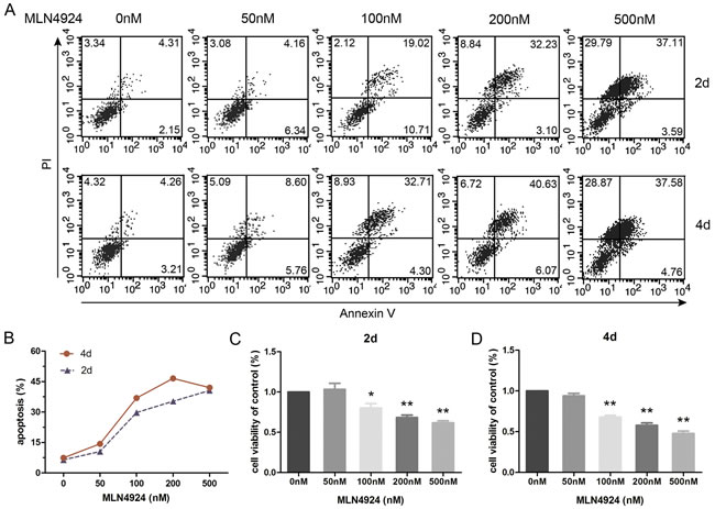 Figure 5: Inhibition of neddylation induces apoptosis of BMDCs. BMDCs were cultured with different doses of MLN4924 for 2 or 4 days. A. Cells were stained with Annexin V to analysis the impact of concentration and time on apoptosis. B. The curves represent the percentage of apoptosis following 2 and 4 days treatment. Trypan blue exclusion assay was employed to evaluate cell viability in 2 days C. and 4 days D. treatment.