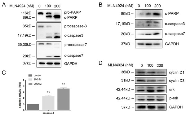 Figure 6: MLN4924 induced apoptosis is caspase dependent. BMDCs were cultured with MLN4924. Total cellular protein extracts were prepared and subjected to immunoblotting by using A. anti-PARP, anti-caspase-3, anti-caspase-7 antibodies and B. anti-cleaved PARP, anti-cleaved-caspase-3, anti-cleaved-caspase-7 antibodies. C. Caspase-3 activity was examined by caspase activity kit. D. Immunoblotting analysis was performed for erk, p-erk, cyclin D1 and cyclin D3 expression.