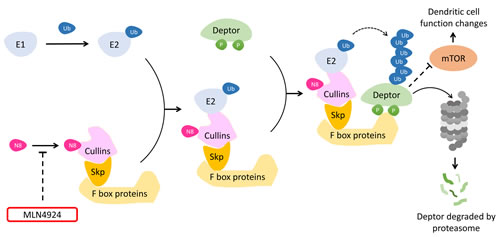 In conclusion, these experiments validated that neddylation inhibtion could suppress DC functions. Cul-1 deneddylation led to Deptor accumulation and subsequent mTOR inactivation, which had an inhibitory effect on DCs. Strategies targeting neddylation to suppress dendritic cell function might be viable therapeutic intervention against diseases associated with immune dysfunction.