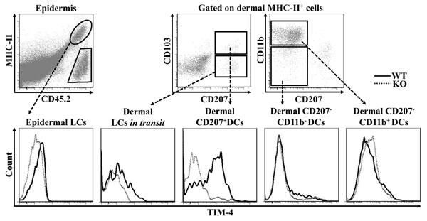 Figure 1: TIM-4 is differentially expressed by the distinct subsets of cutaneous DCs. Epidermal and dermal cells were freshly-isolated from the skin TIM-4 WT and KO mice. Representative FACS dot plots for epidermal LC (MHC-II+CD45.2+), dermal LCs in transit (MHC-II+CD207+CD103-), dermal CD207+ DCs (MHC-II+CD207+CD103+), dermal CD207-CD11b- DCs (MHC-II+CD207- CD11b-) and dermal CD207-CD11b+ DCs (MHC-II+CD207-CD11b+) (upper panel). The MFI of TIM-4 expression in each cutaneous DC subset (lower panel). All data represent one of at least four independent experiments, with 2-5 mice per experiment.