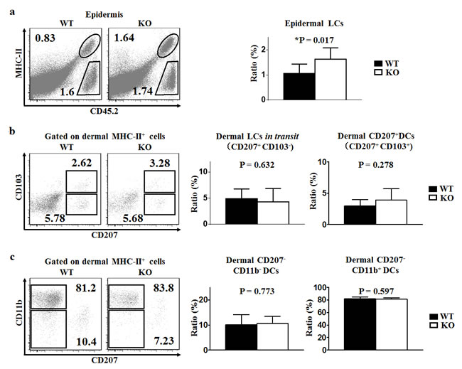Figure 3: TIM-4 deficiency increases the ratio of epidermal LCs. Epidermal and dermal cells were freshly-isolated from the skin of TIM-4 WT and KO mice. a.-c. Representative FACS analysis of epidermal LCs (a), dermal LCs in transit and dermal CD207+ DCs (b), dermal CD207-CD11b- DCs and dermal CD207-CD11b+ DCs (c) from the trunk skin of TIM-4 WT and KO mice (left panel). The ratios of different skin DC populations in TIM-4 WT and KO mice (right panel). Data represent the results of at least four independent experiments, with 2-5 mice per experiment.