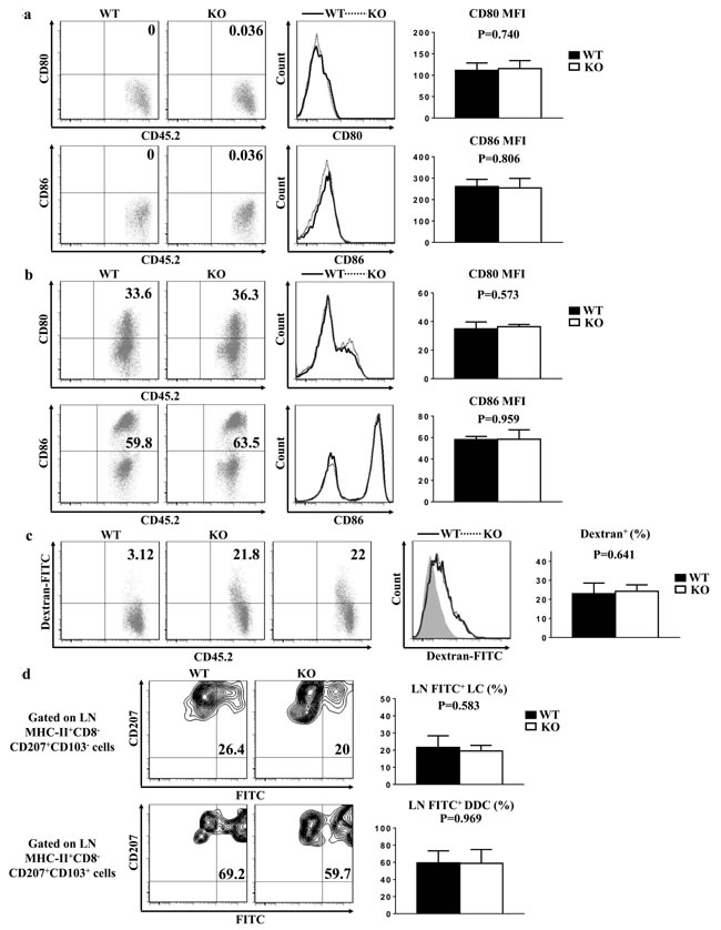 Steady-state epidermal LCs are normally immature, and hardly express co-stimulatory molecules indispensable for LC eliciting T cell priming. Upon maturation, LCs enhance the expressions of these co-stimulatory molecules, including CD80 and CD86. The baseline expressions of CD80 and CD86 in the freshly-isolated epidermal LCs from TIM-4 WT and KO mice were uniformly low (Figure 5a). After 60 hours of in vitro culture, the expressions of CD80 and CD86 increased significantly as expected, but the expression levels of CD80 and CD86 in the cultured LCs were comparable between TIM-4 WT and KO mice (Figure 5b). These results indicate that TIM-4 deficiency does not affect the immature status of epidermal LCs and their ability to develop a mature phenotype in vitro.