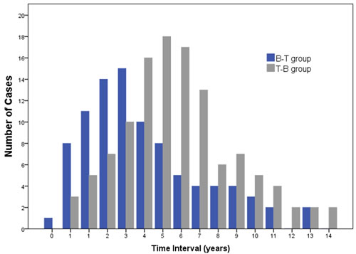 In our study, there were 91(0.49%) patients in B-T group, 117 (0.91%) patients in T-B group, and 53 cases in B = T group. During the entire follow-up period, there were 261(0.83%) patients diagnosed with co-existing BC and TC.