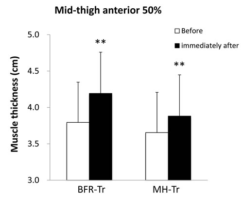 Figure 1: Muscle thickness of mid-thigh at anterior 50% before and immediately after exercise session. Data are given as mean (± SD). **Different from before, P < 0.01.