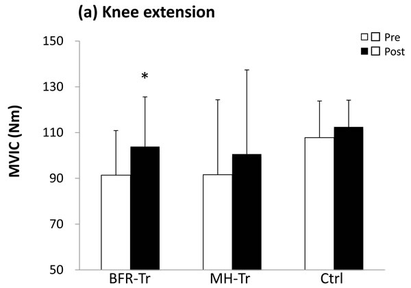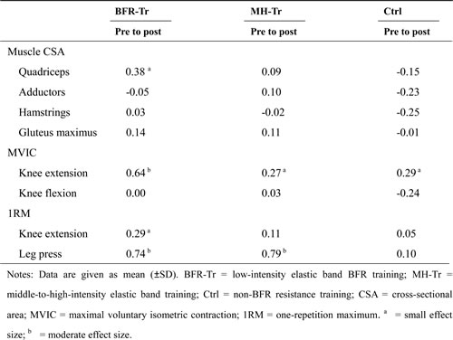 A significant group by time interaction was observed for muscle CSA (p < 0.001 for quadriceps), MVIC (p = 0.028 for knee extension) and leg press 1RM (p < 0.001), but not for knee extension 1RM (p = 0.076). Quadriceps muscle CSA (6.9%) was increased (p < 0.001) in the BFR-Tr group, but not in the MH-Tr (1.5%, p = 0.871) and the Ctrl (-2.2%, p = 0.395) groups (Figure 2). Knee extension MVIC (13.7%) was increased (p = 0.028) in the BFR-RT group, but not in the MH-Tr (p = 0.196) or Ctrl (p = 0.810) groups (Figure 3a). Knee extension 1RM (7.6%) tended to be increased (p = 0.076) in the BFR-RT group, but not in the MH-Tr (p = 0.605) or Ctrl (p = 0.998) groups (Figure 3b). Leg press 1RM (16.4% and 17.6%) was increased (both p < 0.001) in the BFR-RT and the MH-Tr groups, respectively, but not in the Ctrl (p = 0.912) group (Figure 3c). The magnitude of effect size between pre- and post-training was larger in the BFR-Tr group than in the MH-Tr group for quadriceps muscle CSA (small vs. trivial), knee extension MVIC (moderate vs. small), and knee extension 1RM (small vs. trivial), but not for leg press 1RM (moderate vs. moderate) (Table 5).