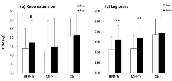 In the BFR-Tr group, increased muscle strength (%change per session and effect size) in this study was lower than that in the previous study [21] for knee extension (0.32% vs. 1.09% and 0.29 vs. 0.70) and leg press 1RM (0.68% vs. 1.39% and 0.74 vs. 0.98). In general, elastic band training did not large stimulation in the 1RM strength because resistance type is dramatic difference between elastic bands and weight machines. Thus, it appears that the difference in improvement in muscle strength between elastic bands and weight machines is attributed to unequal neural adaptations.
