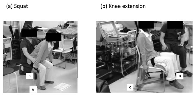 During squat exercises, knee joint range of motion (ROM) and hip joint ROM were approximately 100-0 degrees and 100-0 degrees, respectively, while during knee extension exercises, knee joint ROM was approximately 95-15o and hip joint ROM was maintained at 90o (with 180o being full extension). Subjects were instructed not to let the band snap them back to the start position but rather to consciously control the return movement such that it would take twice as long as the stretching movement. In addition, elastic band elongation was measured by tape measure for squat (distance from outside foot [a] to grip [b]) and knee extension (distance from tie on posterior chair leg [c] to ankle [d]) exercises (Figure 4). The measurements of ROM and elastic band elongation were completed at the 6th week and 12th week of the training period (Figure 5).