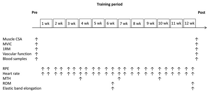 Subject testing took place before the start of the study (pre) and 3-7 days after (post) the 12-week training period. The order of measurements were MRI, venous blood samples, vascular function tests [central systolic blood pressure (c-SBP), central-augmentation index (c-AIx), cardio-ankle vascular index testing (CAVI), ankle brachial pressure index (ABI)], maximum voluntary isometric contraction (MVIC) and 10RM strength. Figure 5 shows the testing schedule for each of the measurements taken during the 12 week experimental period. All data were obtained from the right side of the body. Considering the schedule of examiners, all subjects and variable technologists, the MRI (9:00 and 15:00 hours), venous blood samples and arterial function tests (after 6-7 hours of fasting, 9:00 and 15:00 hours), and MVIC (9:00 and 15:00 hours) measurements were obtained on two days. The subjects were instructed to not drink alcohol or caffeine during the 24-hour period and from performing any strenuous exercise during the 48-hour period prior to pre- and post-training measurements.