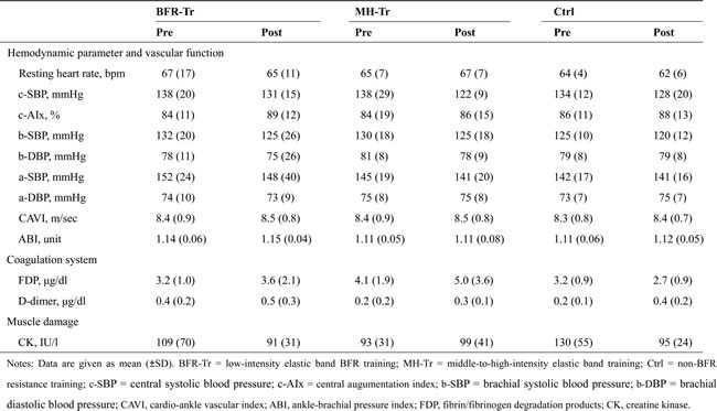 Table 2: Changes in hemodynamic parameter and vascular function, coagulation system and muscle damage after 12 weeks of training period.