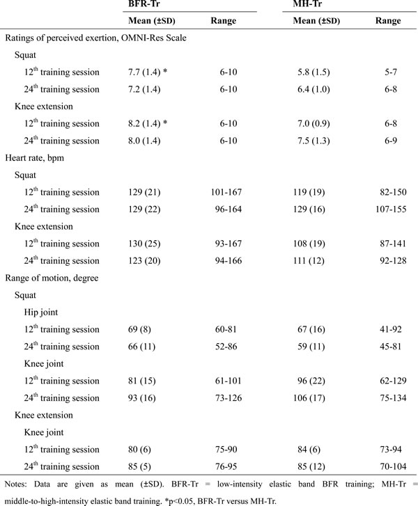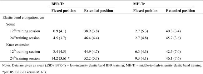 There were no differences between BFR-Tr and MH-Tr groups in the elastic band elongation (p = 0.734 for squatting and p = 0.738 for knee extension, respectively) (Table 3), ratings of perceived exertion (p = 0.075 for squatting and p = 0.341 for knee extension, respectively), and range of motion (p = 0.073 (knee joint) and p = 0.311 (hip joint) for squatting and p = 0.387 for knee extension, respectively). Heart rate was higher in the BFR-Tr group than in the MH-Tr group for squatting (p = 0.515), but not for knee extension (p = 0.047) (Table 4).