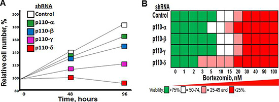 Figure 2: Effect of p110-δ knockdown on MM cell growth and bortezomib sensitivity. (A) Effect of p110-isoform specific shRNA on MM cell growth. RPMI8226 cells were transfected as indicated, selected in puromycn and cell number counted at indicated times. (B) Effect of p110-isoform specific shRNA on MM cell sensitivtiy to bortezomib. Cells were transfected as indicated, treated with bortezomib and cell viability determined using the XTT assay.