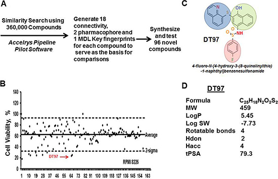Figure 3: High-throughput screening of chemical compounds to identify novel p110-δ inhibitors. (A) Target structures were searched using 360,000 compounds in the drug discovery library and Accelrys Pipeline Pilot Software. Similarity searches were performed through comparison of molecular fingerprints. The Accelrys Pipeline Pilot (version 8.0.1.600) was used to generate 18 connectivity, 2 pharmacophore and 1 MDLKeys fingerprints for each compound to serve as the basis for comparisons. The two pharmacophore fingerprints were averaged due to strong redundancy, leaving a total of 21 fingerprint types for the analysis. These are circular fingerprints based on substructure environments of a specific length (2, 4, or 6 atoms) centered about each atom of the molecule. Each atom of the molecule generates such an integer string, with each integer representing an atom within x atoms of the initial point. The composite of these strings is a matrix of character strings representing the entire molecule, i.e., the aggregate of the parts is the whole). Different fingerprints have slightly different strengths and weaknesses, so the UC DDC executes each compound search as 21 parallel searches that are combined as shown in the graphic below. (B) Viability of MM cells after treatment with either the 96 compounds identified in the virtual screen or with known commercially-available PI3K inhibitors. (C) Chemical structure of DT97. (D) DT97 physico-chemical properties.