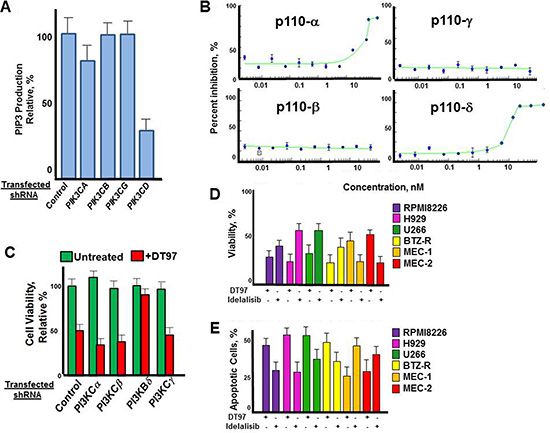 Figure 4: Effect of DT97 on p110-δ kinase activity. (A) Effect of individual p110 isoform knockdown on PIP3 production. RPMI8226 cells were transfected with shRNA to scrambled control or isoforms PIK3CA, PIK3CB, PIK3CG or PIK3CD. PIP3 production was then determined from the transfected cells after puromycin selection. Data points represent the average value from triplicate measurements. (B) Dose-dependent effect of DT97 on purified p110-δ. Assays were performed in triplicate, values represent the mean and error bars represent the SD. (C) Effect of DT97 treatment on RPMI8226 cells after transfection with control shRNA or shRNA specific to individual PIK3C isoforms. Cells were transfected, selected in puromycin and cell viabiltiy determined using the XTT assay. Values represent the average of triplicate measurements. (D) Effect of DT97 and idelalisib on MM and CLL cell viability. The effect of each agent at 1 uM was determined using the XTT assay after treatment for 72 h. Values represent the average of triplicate measurements. (E) Effect of DT97 and idelalisib on apoptosis in MM and CLL cells. The effect of each agent at 1 uM was determined by counting the number of apoptotic cells after 24 h. Values represent the average of triplicate measurements.