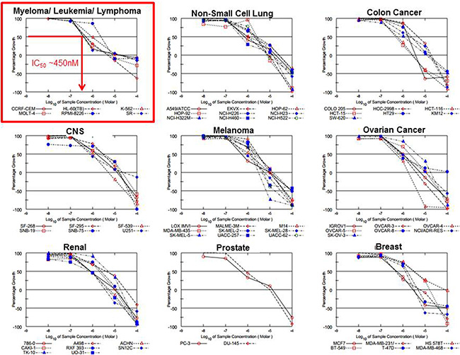 The anticancer effect of DT97 was externally validated using the NCI-60 panel of human cancer cells (Figure 6). The anticancer efficacy of DT97 prioritized to MM, leukemia and lymphoma cancer cell lines (Table 2). The most potent effect was seen in the MM cell line RPMI8226 (IC50 ~450 nM).