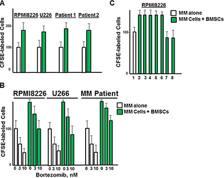 Figure 8: Effect of DT97 on MM cells in the presence of BMSCs. (A) Effect of BMSCs on the growth of MM cells. RPMI8226 cells were labeled with CellTrace, and cultured alone or with BMSCs. The number green cells was then counted by confocal microscopy. Values represent the arithmetic mean and error bars represent the SD. (B) Effect of DT97 on bortezomib sensitivity in the presence of BMSCs. RPMI8226 cells were labeled with CellTrace, and cultured alone or with BMSCs. Cells were then treated with borteomib at indicated concentrations and the number of green cells counted at 72 h. (C) Effect of DT97 on MM cells alone or with bortezomib in the presence of DT97. RPMI8226 cells were labeled with CellTrace, treated as indicated and cultured alone or with BMSCs. RPMI8226 cells were cultured alone (lane 1) or with BMSCs (lanes 2–9). Cells were treated as follows: lanes 1, 2- no addition, lane 3- bortezomib 1 nM, lane 4-bortezomib 3 nM, lane 5- bortezomib 5 nM, lane 6- DT97 250 nM, lane 7- bortezomib 3 nM and DT97 250 nM, lane 8- bortezomib 5 nM and DT97 250 nM. Cells were then treated as indicated and the number of green cells counted at 72 h. Assays were performed in triplicate, values represent the arithmetic mean, error bars represent the SD.