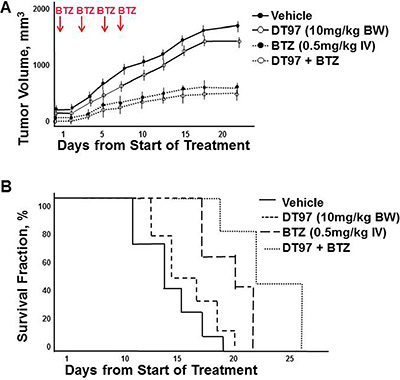 Five week old nude mice flanks are injected subcutaneously with MM.1S myeloma cells. Tumors formed within two weeks and mice were then treated intravenously with vehicle, bortezomib, DT97 or both bortezomib and DT97. Treatment with bortezomib alone or bortezomib with DT97 dramatically reduced tumor growth (Figure 9A). Kaplan-Meier survival analysis indicated that treatment with bortezomib and DT97 also improved overall survival (OS) relative those mice treated with vehicle, DT97 or bortezomib alone (Figure 9B). OS for untreated mice was 14 days, DT97 treatment alone was 16 days, bortezomib alone was 20 days and DT97+bortezomib was 23 days (p < 0.05).