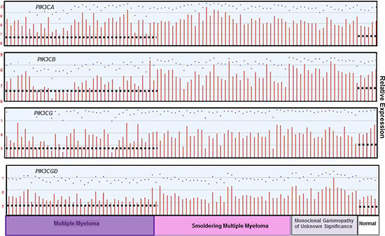 Figure 10: PIK3C isoform expression in normal, MGUS, SMM and MM patients. The relative expression of each PI3K p110 isoform was determined using dataset GDS4968 in which bone marrow PCs were isolated from patients with monoclonal gammopathy of undetermined significance (MGUS), smoldering multiple myeloma (MM), or MM. The median-centered average of expression is indicated with the dashed line.