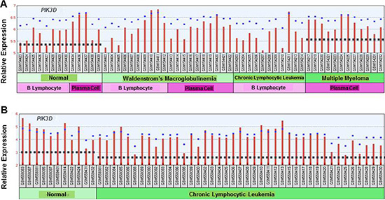 Figure 11: (A) Comparison of PIK3C isoform expression in normal, WM, CLL and MM patients. The relative expression of the PIK3CD isoform was determined using dataset GDS2643 in which B lymphocytes and PCs were isolated from normal patients or those diagnosed with WM, CLL or MM. The median-centered average of expression is indicated with the dashed line. (B) Comparison of PIK3C isoform expression in B lymphocytes from normal individuals and CLL patients. The relative expression of the PIK3CD isoform was determined using dataset GDS4167 in which B lymphocytes were isolated from normal patients or those diagnosed with CLL. The dashed line indicates the edian-centered average of expression.